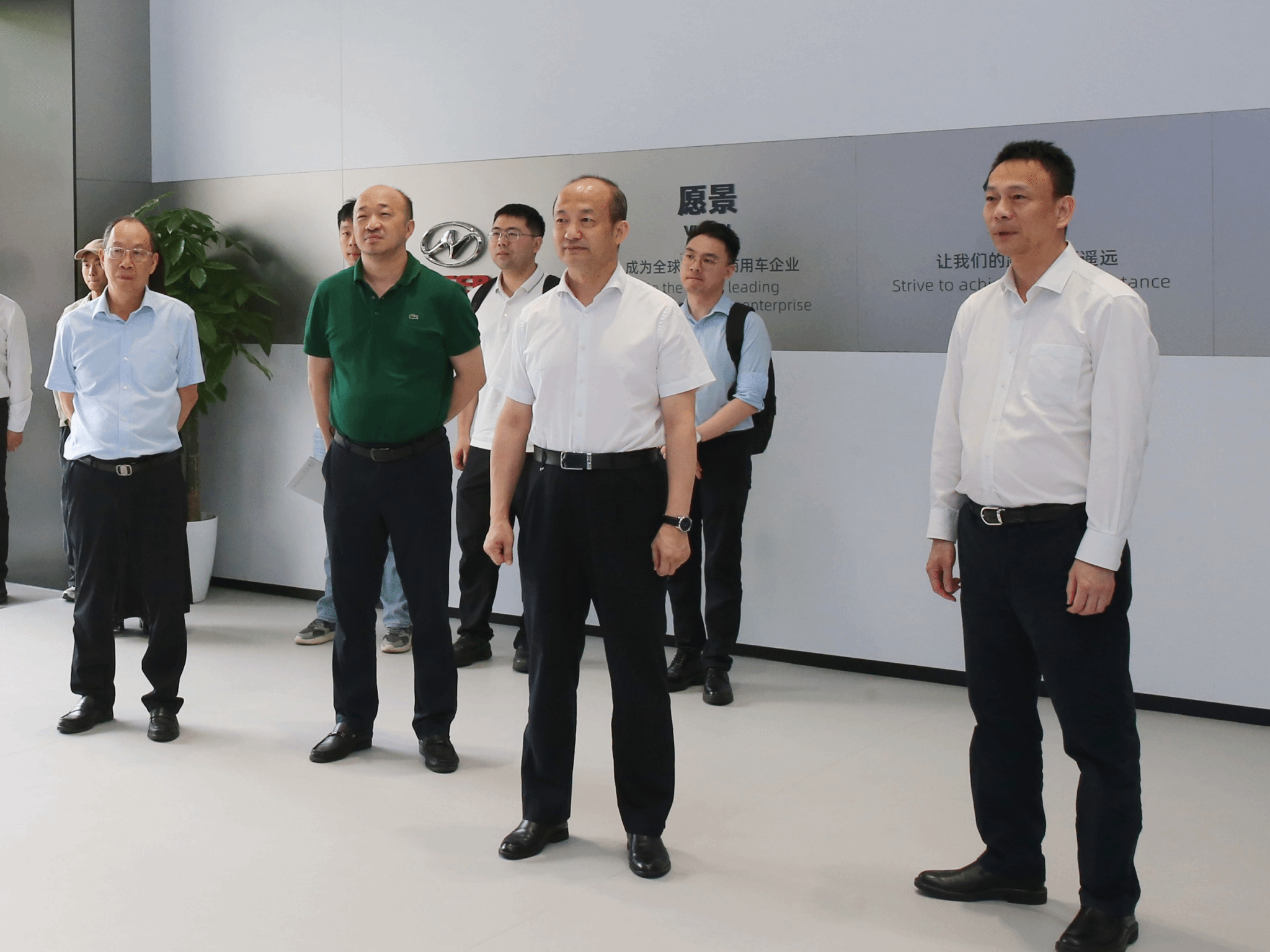福汽集團黨組書記、董事長黃循鈾(前排左三),福汽集團黨組副書記、金龍汽車集團黨委書記、董事長陳鋒(前排左二)參觀展廳