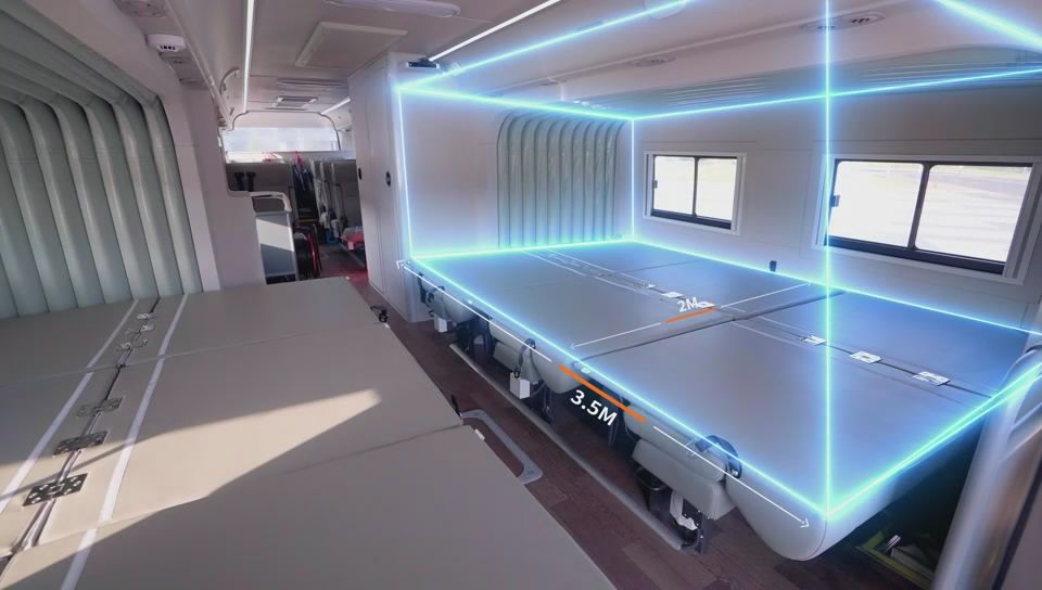 金旅應急(ji)救(jiu)援(yuan)宿(su)營(ying)車(che)(che)采用(yong)成熟的(de)大型客車(che)(che)平臺改制,車(che)(che)長11米(mi),配備(bei)大馬(ma)力柴油(you)發動(dong)機,動(dong)力強勁(jing),可以最(zui)短(duan)時間到(dao)達指定(ding)地點(dian)展(zhan)(zhan)(zhan)開(kai)工(gong)作(zuo)。車(che)(che)輛為(wei)25 + 1的(de)座位設計(ji),座椅(yi)坐臥兩(liang)用(yong),既能(neng)(neng)滿足人(ren)員(yuan)乘坐需求(qiu),又可展(zhan)(zhan)(zhan)開(kai)成為(wei)通鋪用(yong)于(yu)休(xiu)息,還能(neng)(neng)作(zuo)為(wei)臨時辦公(gong)開(kai)會(hui)的(de)場(chang)所(suo),功(gong)能(neng)(neng)十分多(duo)樣。車(che)(che)身(shen)配備(bei)的(de)方(fang)艙(cang)拓展(zhan)(zhan)(zhan)系統,具備(bei)一鍵(jian)伸縮功(gong)能(neng)(neng),且伸縮在35秒以內(nei)即(ji)可完成。在方(fang)艙(cang)向車(che)(che)身(shen)兩(liang)側展(zhan)(zhan)(zhan)開(kai)后,伸出長度可達95厘米(mi),同時將座椅(yi)靠背翻轉成床,就(jiu)可形(xing)成長度達3.5米(mi),寬(kuan)度2米(mi)的(de)通鋪,一張通鋪可睡3 - 5個人(ren),整車(che)(che)能(neng)(neng)夠容納二十幾人(ren)休(xiu)息,充(chong)分保障(zhang)了救(jiu)援(yuan)隊伍的(de)休(xiu)息需求(qiu),確保救(jiu)援(yuan)人(ren)員(yuan)能(neng)(neng)以飽滿的(de)精神(shen)狀態投入(ru)到(dao)搶險救(jiu)災工(gong)作(zuo)中。
