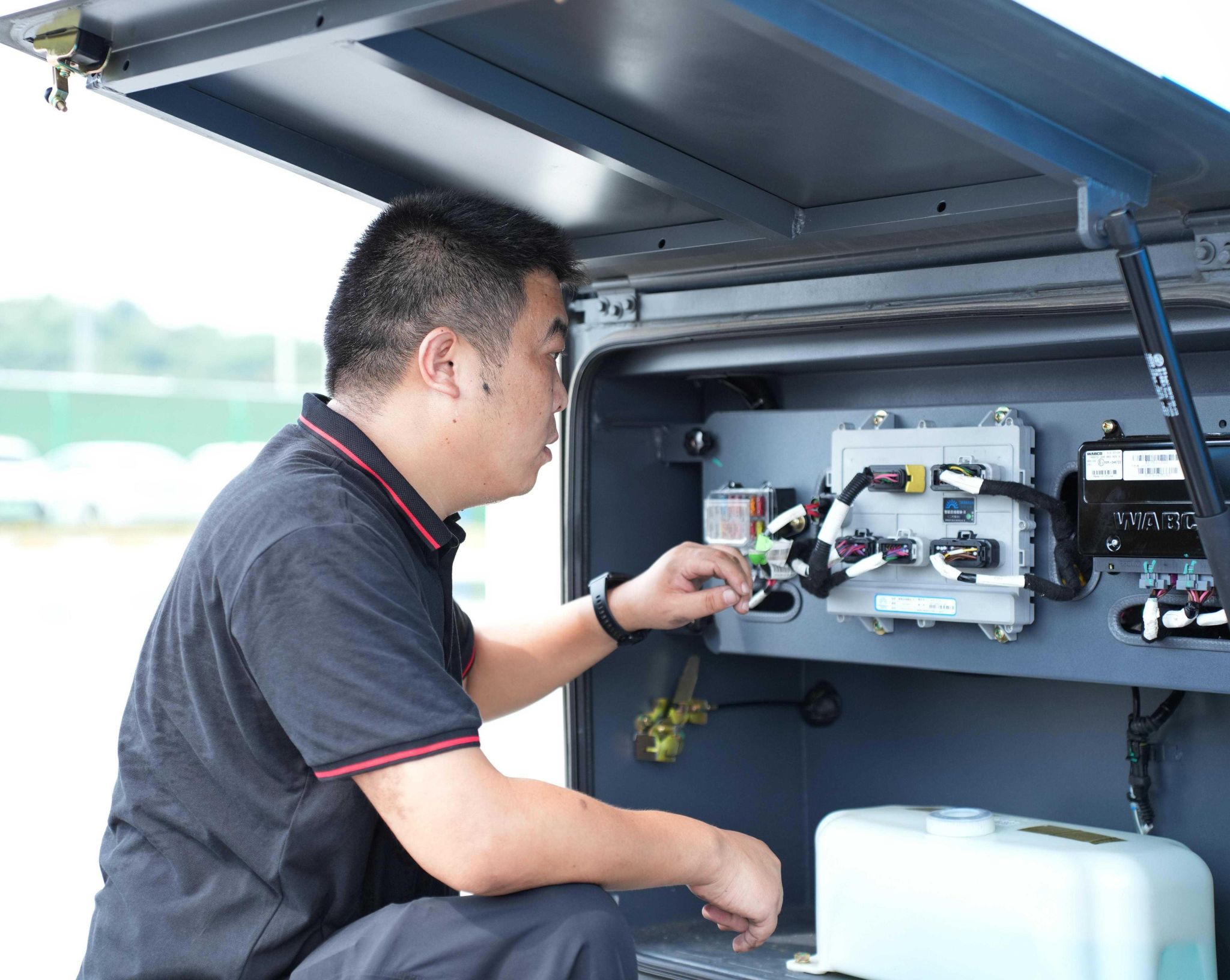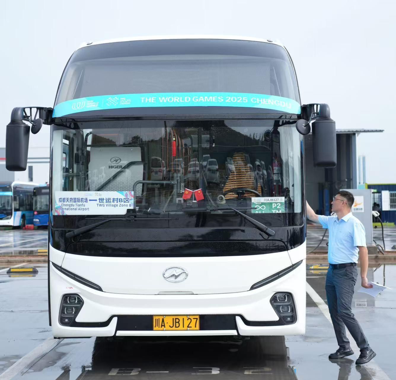依托服務奧運會、卡塔爾世界杯等國際賽事的成熟經驗,蘇州金龍構建“三步走”保障體系。一是,前置協同、嚴苛篩選機制:與客運企業深度對接,精準匹配車型與線路需求,所有車輛經多輪檢測,重點排查發動機、制動、底盤等核心部件,確保“零隱患”上崗;二是配件先行:在成都建立專用備件庫,核心部件儲備充足,實現“即需即供”;三是駐點護航、應急聯動:自8月3日起,技術服務團隊入駐組委會指定區域,24小時全天候待命,直至8月17日賽事收官,并進行動態監管,每日全車系統檢查,重點部位“一車一檔”跟蹤。