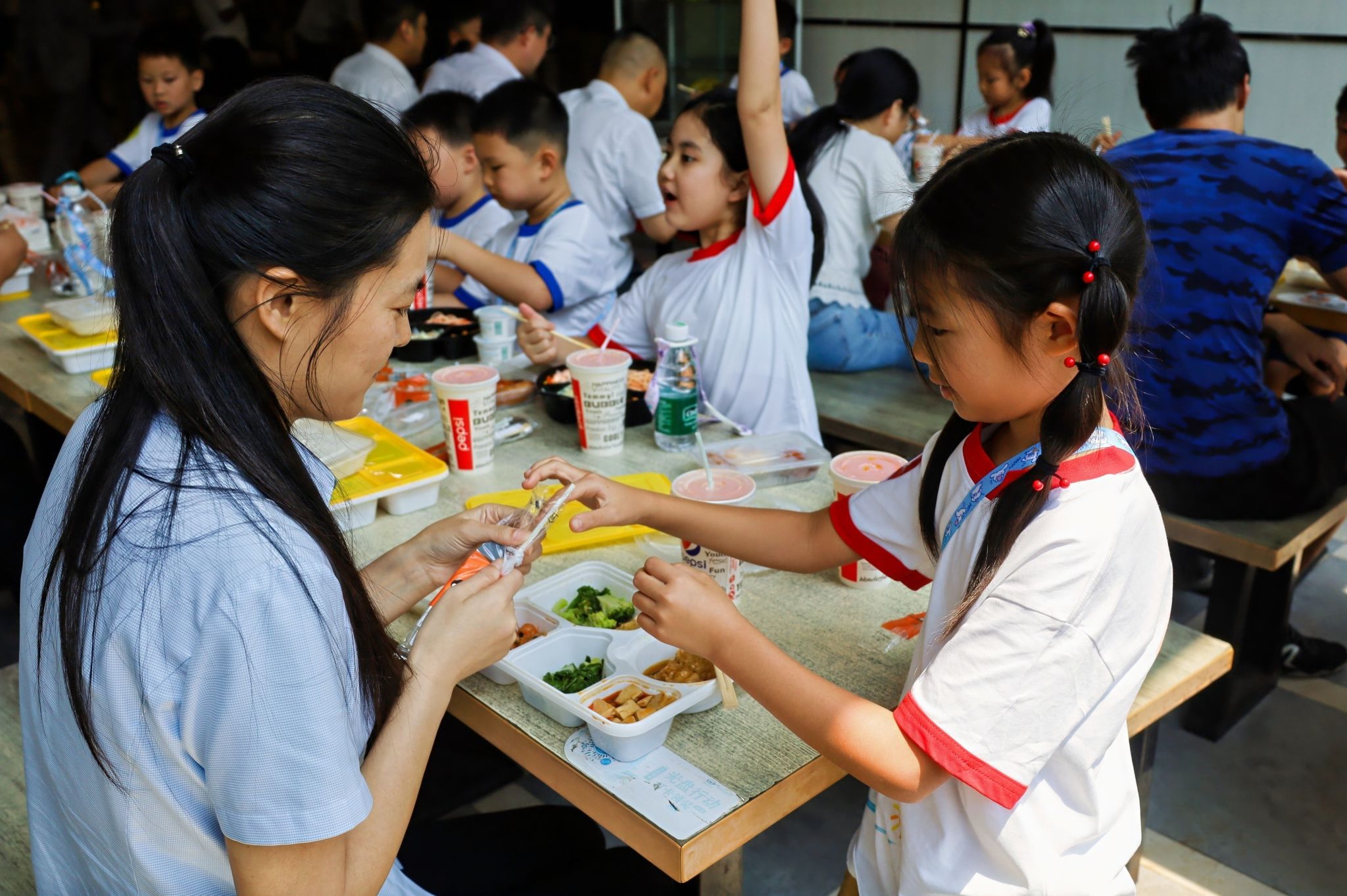 中午,孩子們在工作人員引領下來到了公司尚食軒食堂,與自己的爸爸、媽媽愉快地享用工會和食堂大廚們精心準備的親子餐。吃著愛心蛋撻、美味雞翅、爆汁香腸、香甜可樂、美味汽水,孩子們一個個喜笑顏開、大塊朵頤,上午的炎熱和疲憊也因此一掃而光。