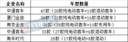 從推出車(che)型(xing)數(shu)量(liang)(liang)來看,數(shu)量(liang)(liang)排名前三的有中通(tong)客車(che)、廈門金旅和(he)南京金龍,數(shu)量(liang)(liang)分別(bie)是47款、38款和38款。